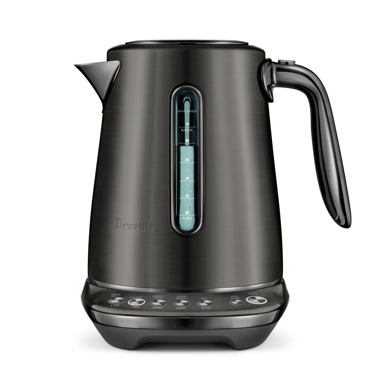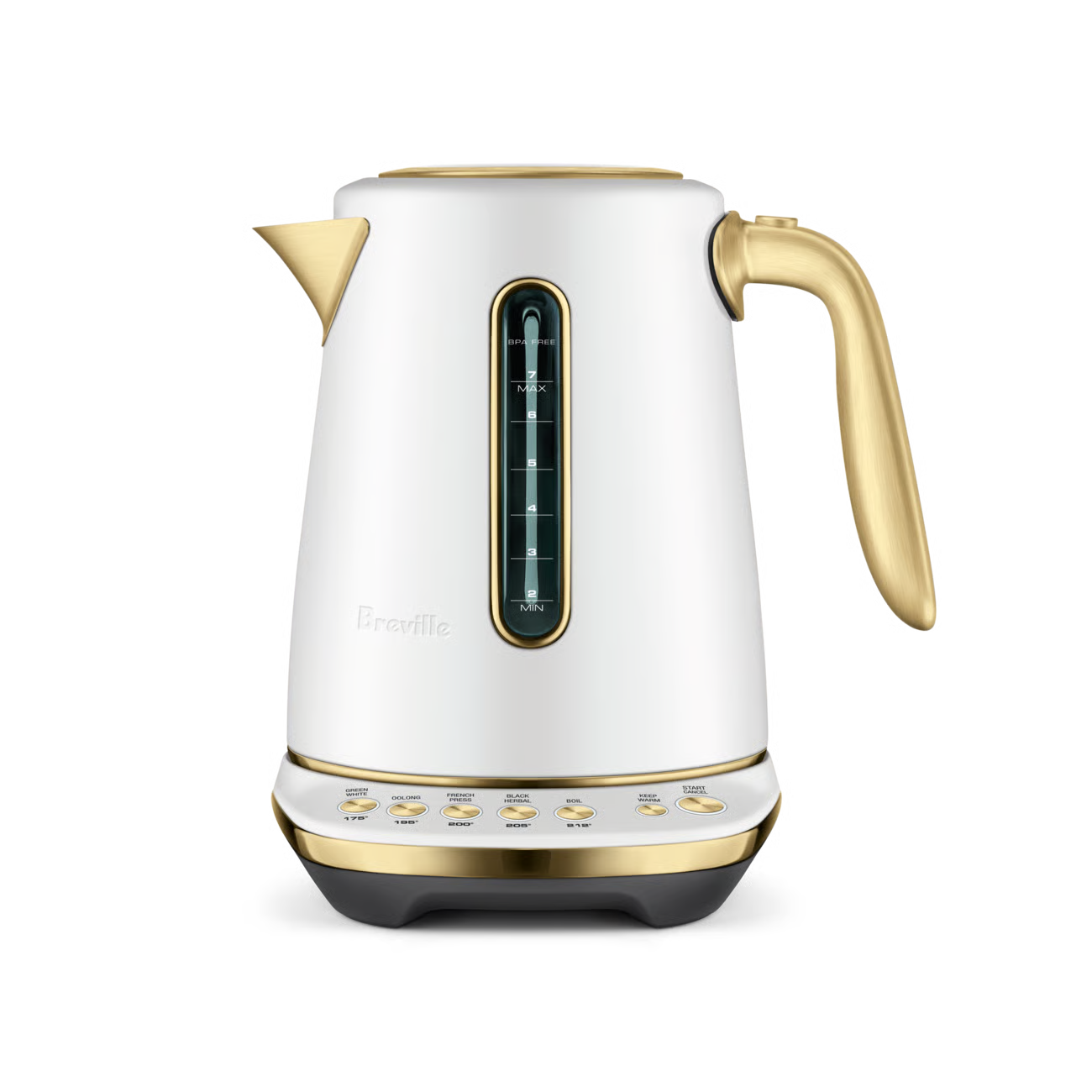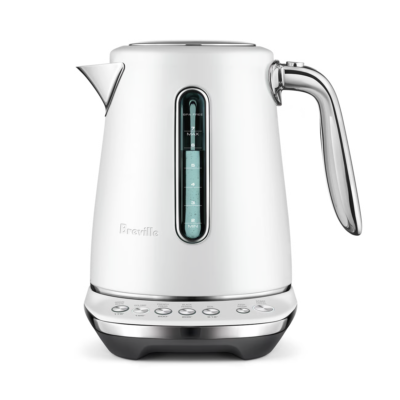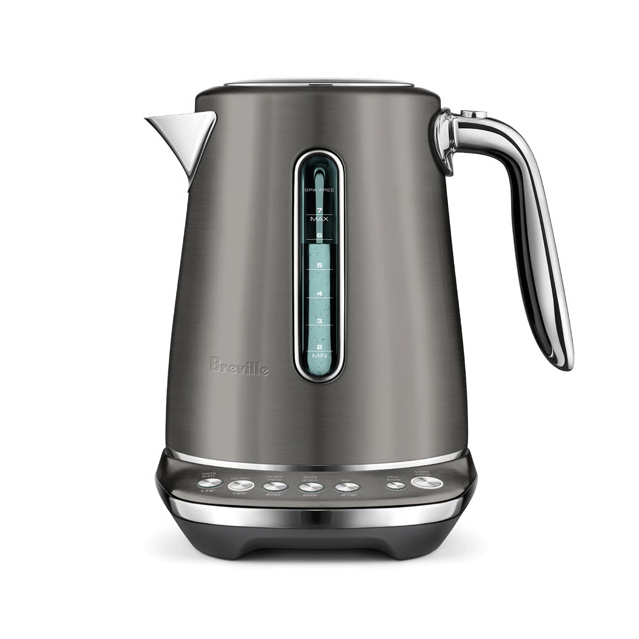 This 7 cup capacity smart kettle knows the ideal temperature to bring out optimal taste and quality of your favorite tea or coffee. 5 temperature settings to brew Black, Green, White, Oolong Tea and French press coffee. Also features a soft opening lid to gently release hot steam and prevent hot water splash back.