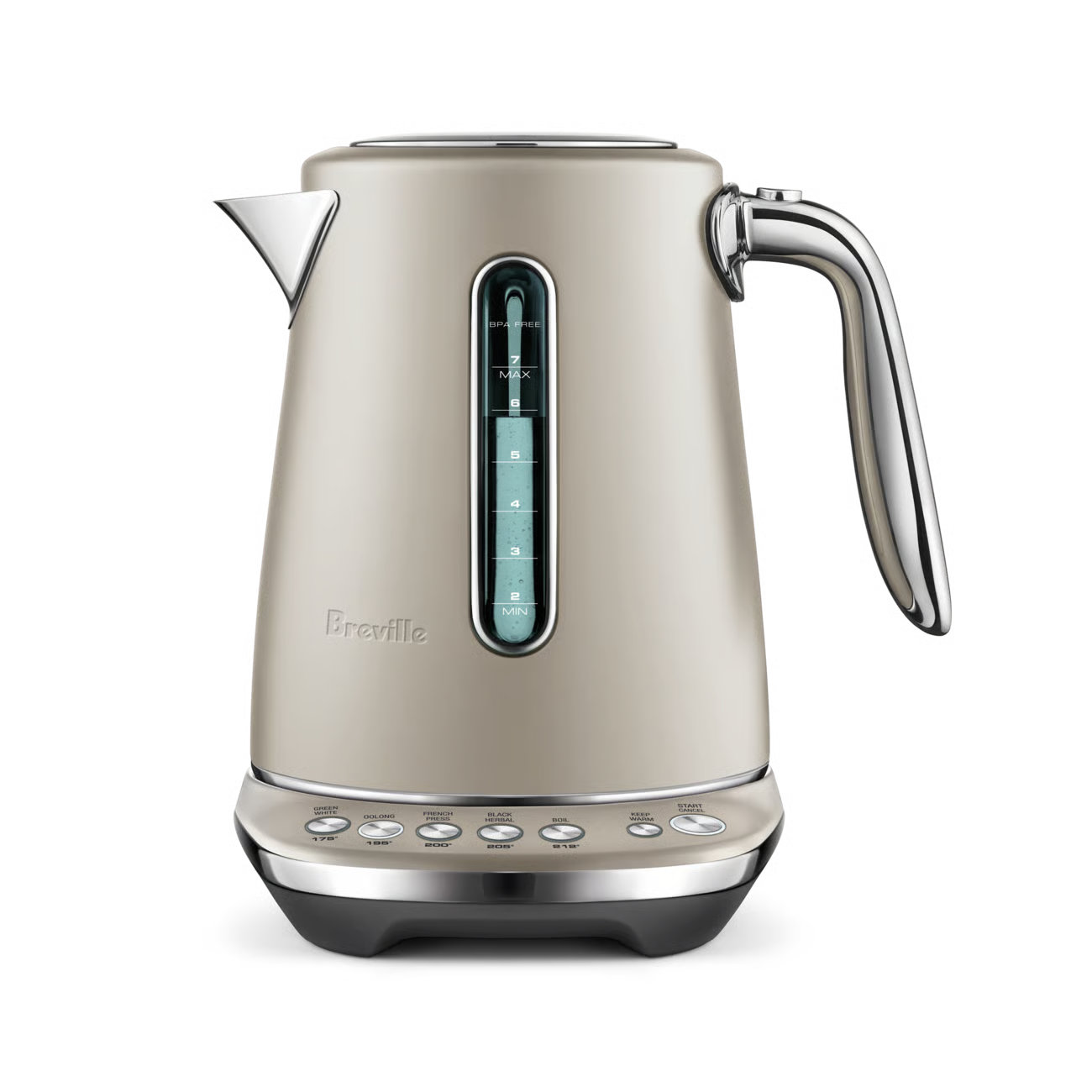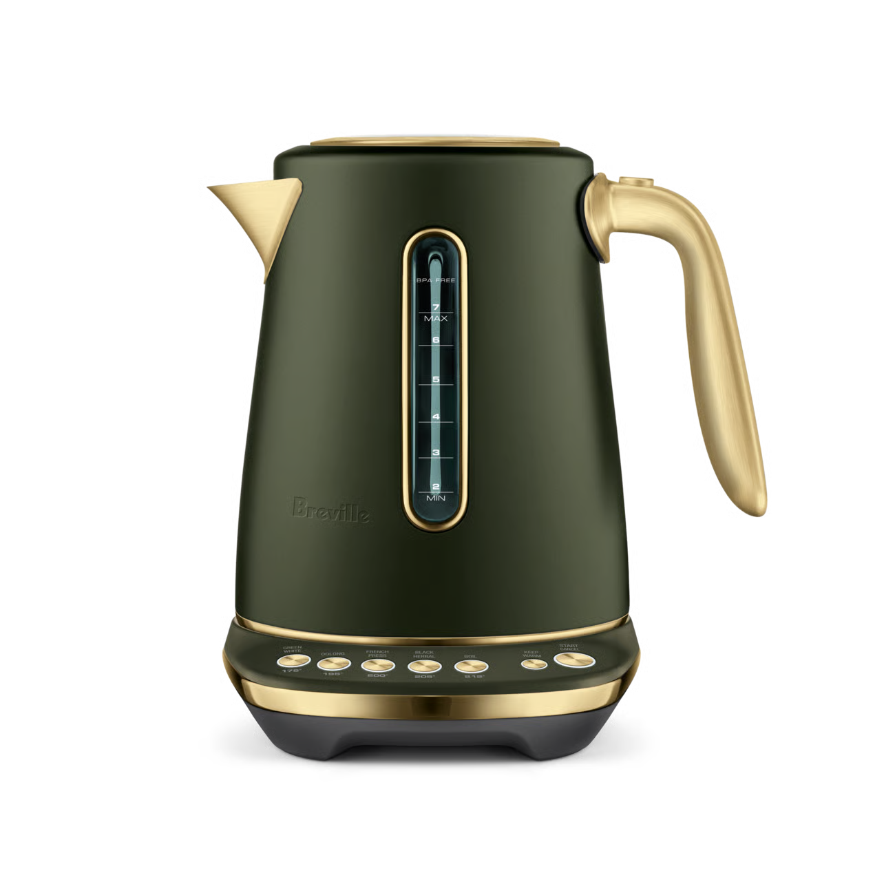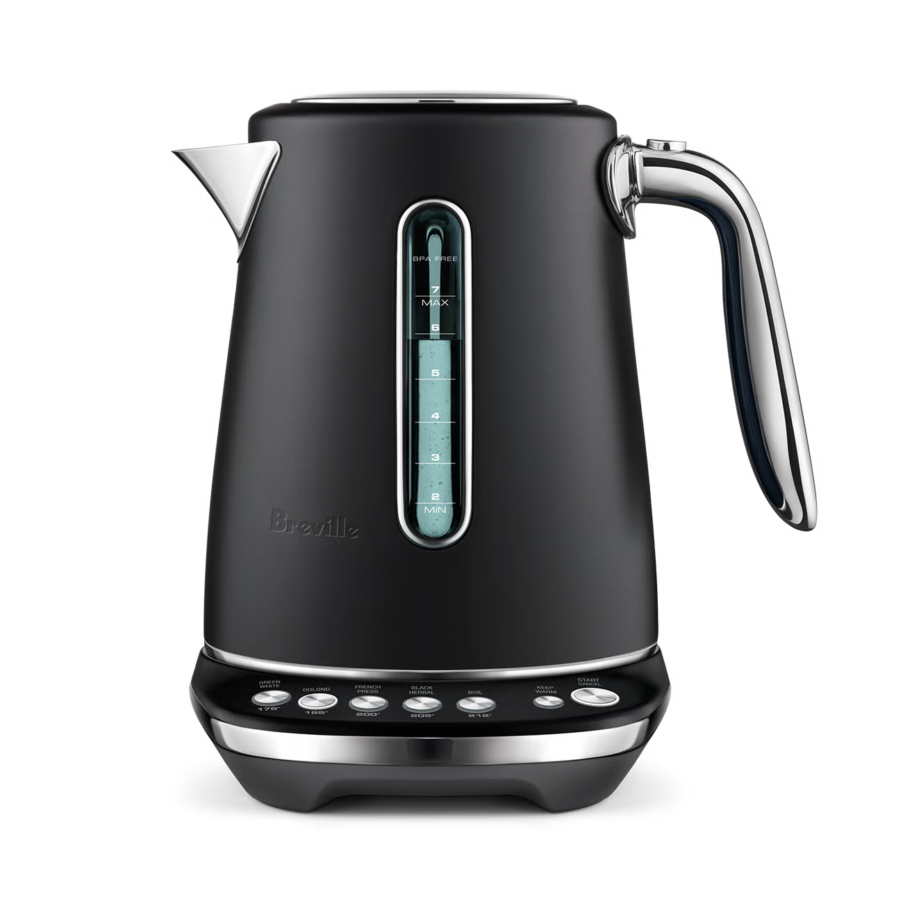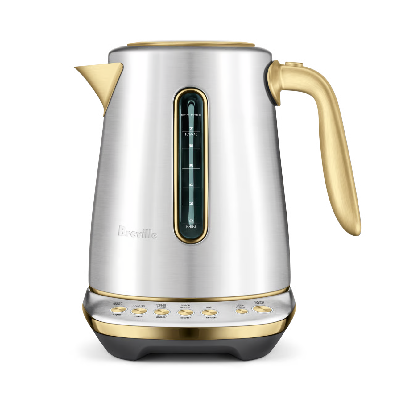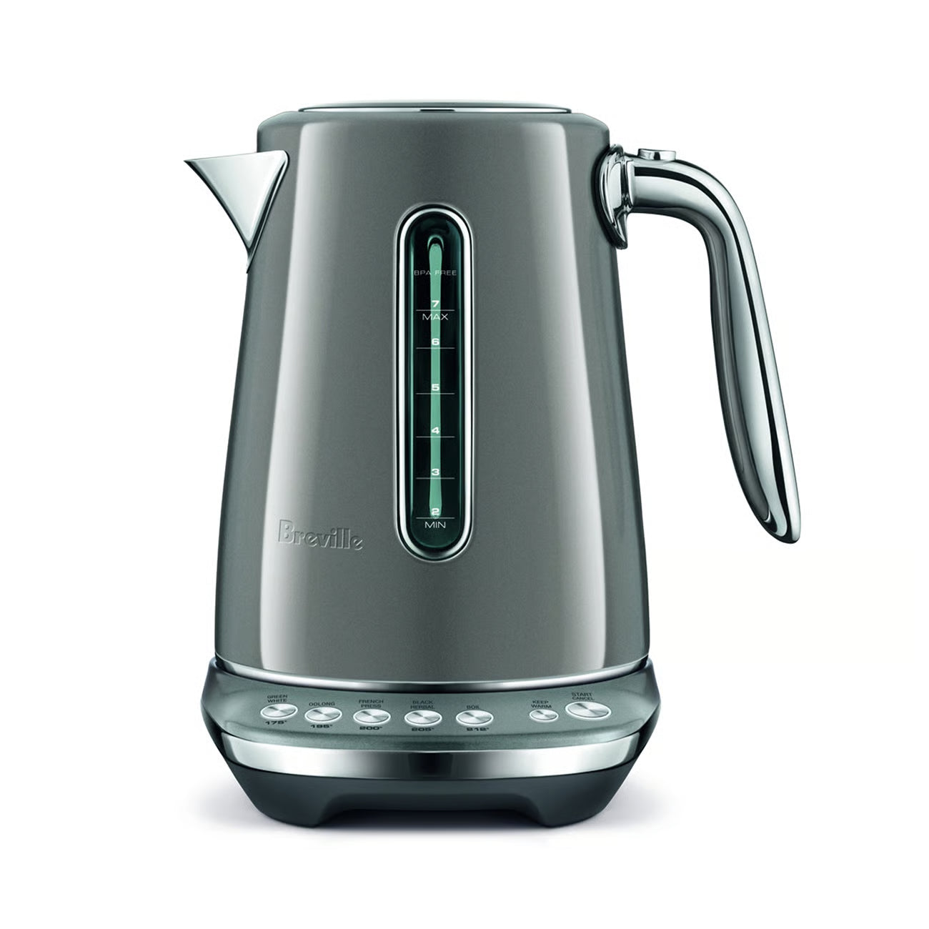 This 7 cup capacity smart kettle knows the ideal temperature to bring out optimal taste and quality of your favorite tea or coffee. 5 temperature settings to brew Black, Green, White, Oolong Tea and French press coffee. Also features a soft opening lid to gently release hot steam and prevent hot water splash back.